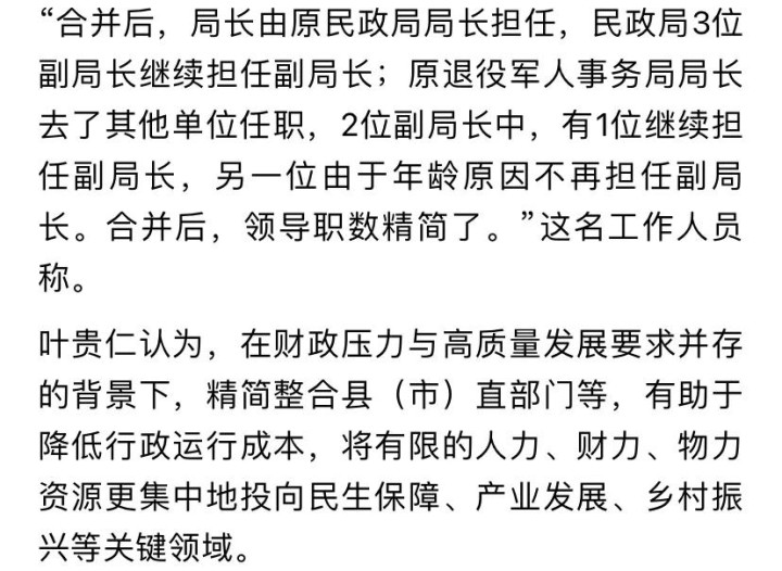 有的人认为机构调整少一堆人事、少一份财政开支,并为这样的合并点赞,同时也建议县级区域有的部门也可以合并。
