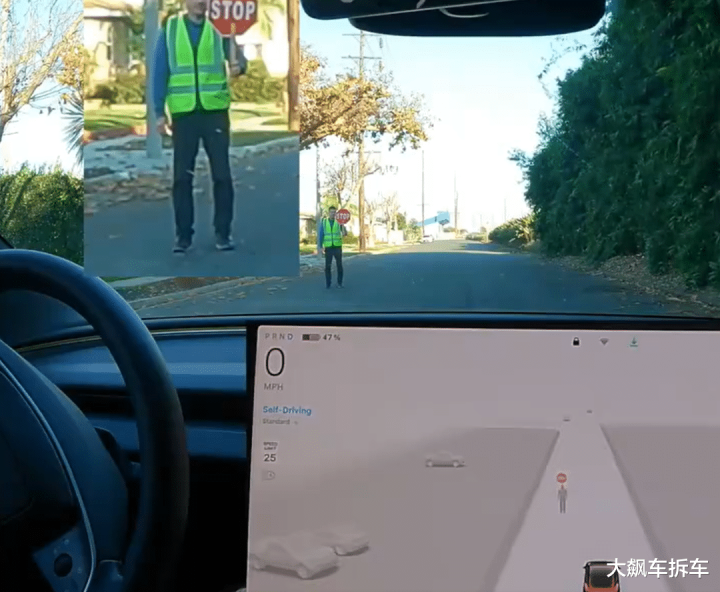 这还没完,还有测试显示,FSD能识别对向车道司机的手势。在一个路口,迎面驶来的一辆皮卡司机挥手示意让特斯拉先左转,FSD也“心领神会”,毫不犹豫、不带急刹地完成了左转操作。另外,就算有人举着“STOP”的牌子,但只要他另一只手示意可以走,车子也能看懂指令直接起步。我们来看视频。