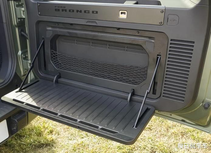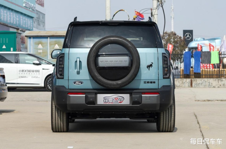 尾部造型,尾窗部分略带倾斜,比一般方盒子少了些呆板的感觉。侧开尾门和背挂备胎,这些经典元素得到保留。备胎罩是中央封闭式,边缘嵌入 LED 灯带,中央还有字母。备胎位置相对靠上,虽然遮挡住了一部分尾窗,但也使备胎没有入侵下方后杠,牌照可以居中布置。