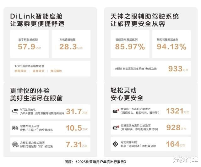 在产品与技术层面,比亚迪以智能化和电动化能力作为用户体验的底层支撑。数字钥匙、智能语音、辅助驾驶、智能泊车、AEB 等功能的高频使用,直接提升了出行安全性与便利性;VTOL 外放电、兆瓦闪充、车载无人机以及不同品牌序列下的特色技术方案,则体现出用户对多样化技术场景的真实需求与认可。
