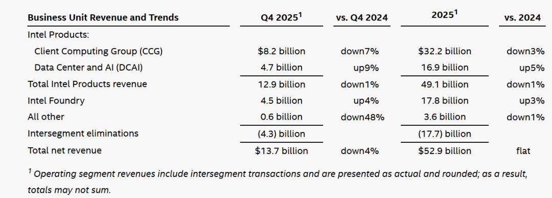 财报显示,英特尔第四季度营收主要由三个部分组成:客户端计算组业务(笔记本电脑芯片)、数据中心和人工智能业务(中央处理器)、代工业务。